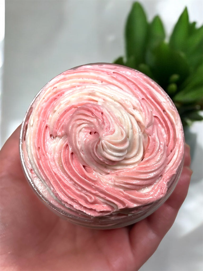 Treat your skin to the ultimate in natural luxury.Experience the difference of deeply nourished, glowing skin!Transform your skincare routine with our All-Natural Whipped Body Butter, handcrafted with love and packed with powerful, organic ingredients that deeply moisturize and rejuvenate your skin. Our luxurious triple butter blend is designed to not only pamper your skin but also address common concerns like stretch marks, discoloration, and cracked skin.